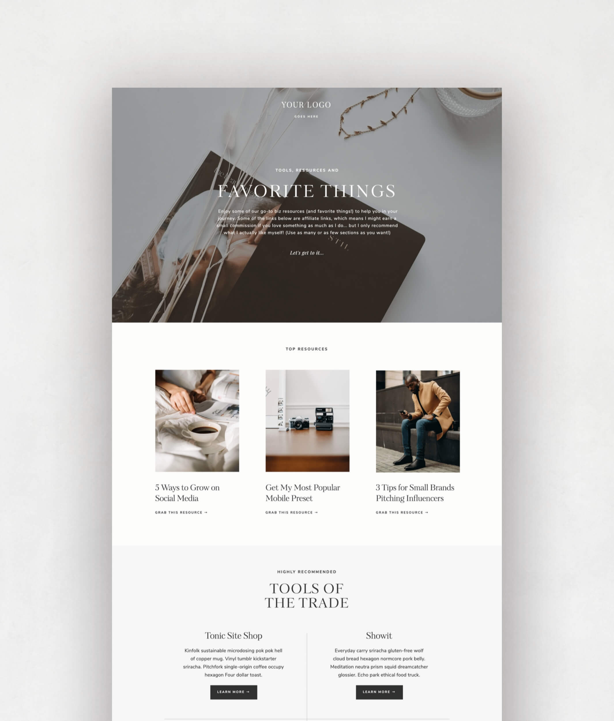 Work smarter, not harder. The Favorite Things page template is the workhorse of your site, connecting your people with the solutions they need, your fave products, resources, and services (and affiliate links) in one very on-brand place.