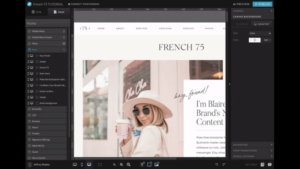 Everything you love about Canva is found (& truly elevated) via Showit. Set brand colors. Check. Upload and add custom fonts. Check. Add logo. Check. And with those three to-dos complete… your template already starts to look like yours. Showit’s drag and drop functionality makes it super easy to select elements, either separately or collectively, to make adjustments to specific sections, pages, or your site overall. Whether the change you want to make is exclusive or universal… it can be done. And get this: without knowing one line of code. Make adjustments, changes, or complete overhauls throughout your site — then preview and publish the changes instantly.