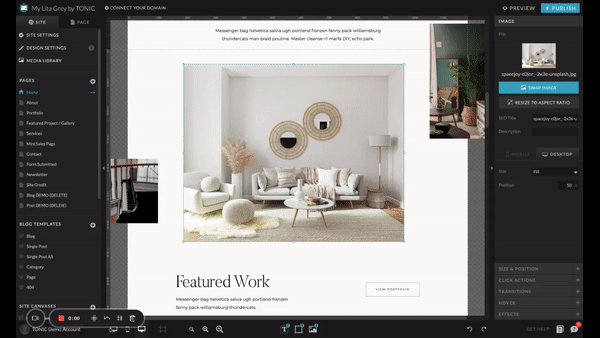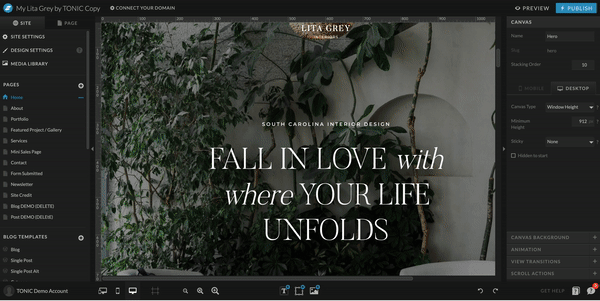 You’ll want to set up Click Actions—aka set the intention for the action you want to happen when someone clicks on an image, button, word, etc—to connect links to pages of your site, social media, etc. Most of the TONIC Click Actions are set for you, but here’s a tutorial about how to navigate Click Actions just in case.
