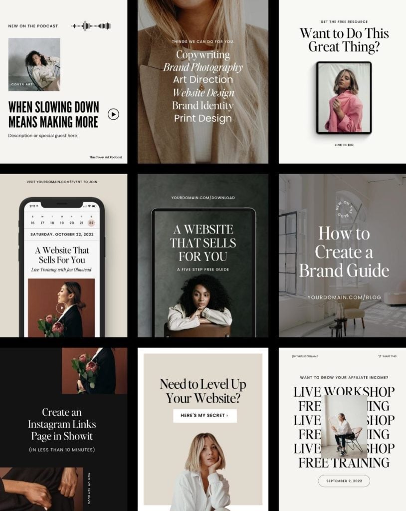 Or, if you want your launch prep to be *really* easy… get the marketing pack edition of our Canva social media templates – all of the content planning has already been done for you! All you’ll have to do is add your own colors and copy, and you’re ready to invite infinite viewers to your new Showit website.