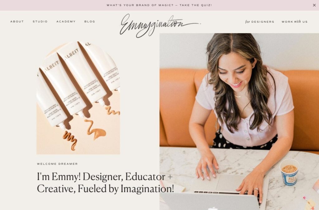 Emmy’s story is one we bet lots of creatives can relate to. So many people are super talented themselves and probably think that because they can create their own website, they should. But Emmy is proof that sometimes outsourcing something can be better. A designer herself (such a compliment!), she needed to get out of her own way and launch a site to showcase her incredible work…. a little faster and with less agonizing than she would have if she started from scratch. She took our Paper Plane, put a REALLY cool pastel + typography spin on it, totally customized it to fit her brand and her vision, and whoa. The result is soooo pretty and perfect for her business needs. We love that she chose Paper Plane too, because it’s like it was made for her – it’s stunning and responsive, beautiful and loaded with features, and (clearly!) super customizable.