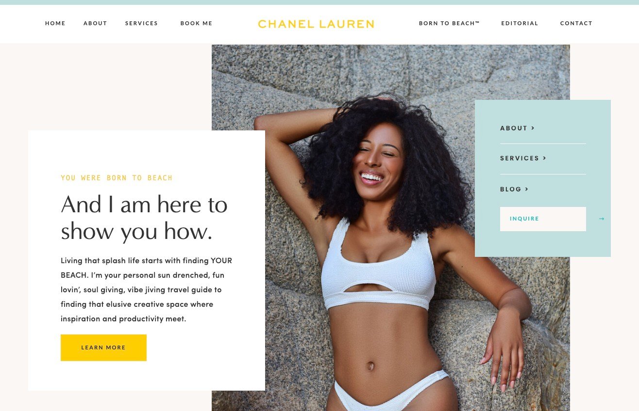 - She’s clearly talented, and her Born to Beach™ page highlights her passions and projects. There’s space for her to highlight blog posts and talk about her up-and-coming podcast. We love how she’s made jumping into her site an experience; it’s like visiting an exotic, yet accessible location.