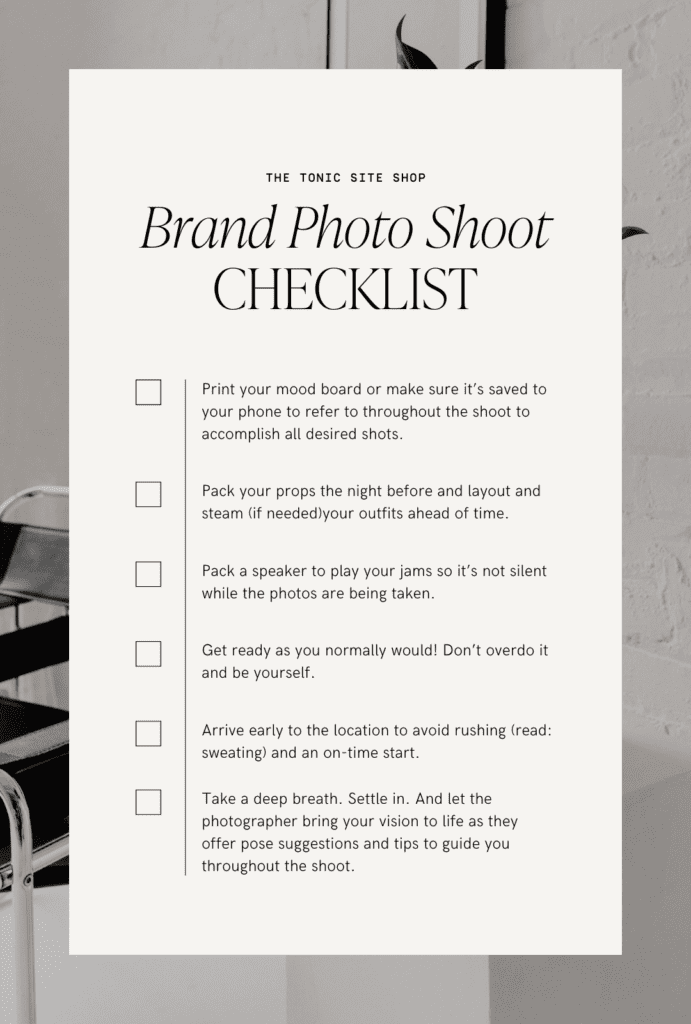 With the logistics checked off your brand shoot to-do list, let’s get into the FUN part: outfits and props! The surefire way to be confident during your shoot is with planned outfits that you know you look amazing in. Identify which pieces in your closet align with the images you want to create — and bring a few options to change into so you have a nice mix. Not sure how to style yourself? Refer back to your mood board or take to Pinterest to source and recreate the inspired looks with pieces you likely already have in your closet.
