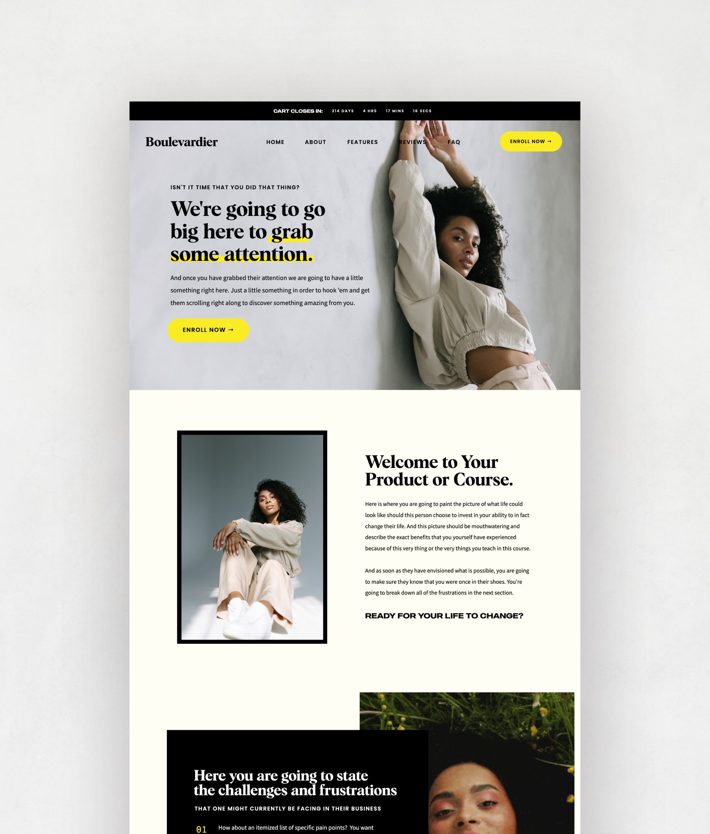 Designed to work standalone or with the full Boulevardier collection. Use it as a dedicated sales page for your signature offer, product launch, or premium service — the design adapts to whatever you’re selling.