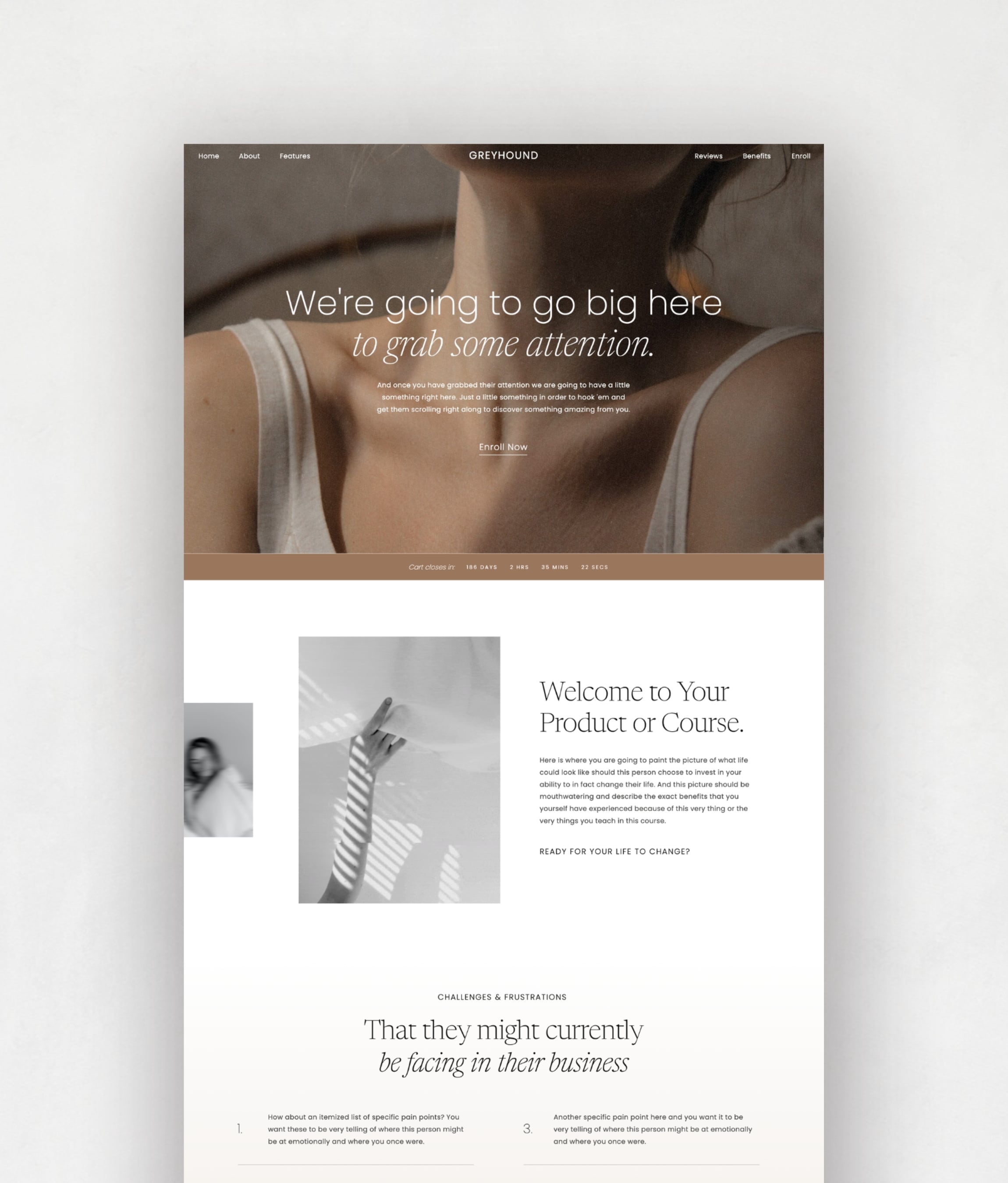 Designed to work standalone or with the full Greyhound collection. Use it as a dedicated sales page for your signature offer, product launch, or premium service โ the design adapts to whatever you’re selling.