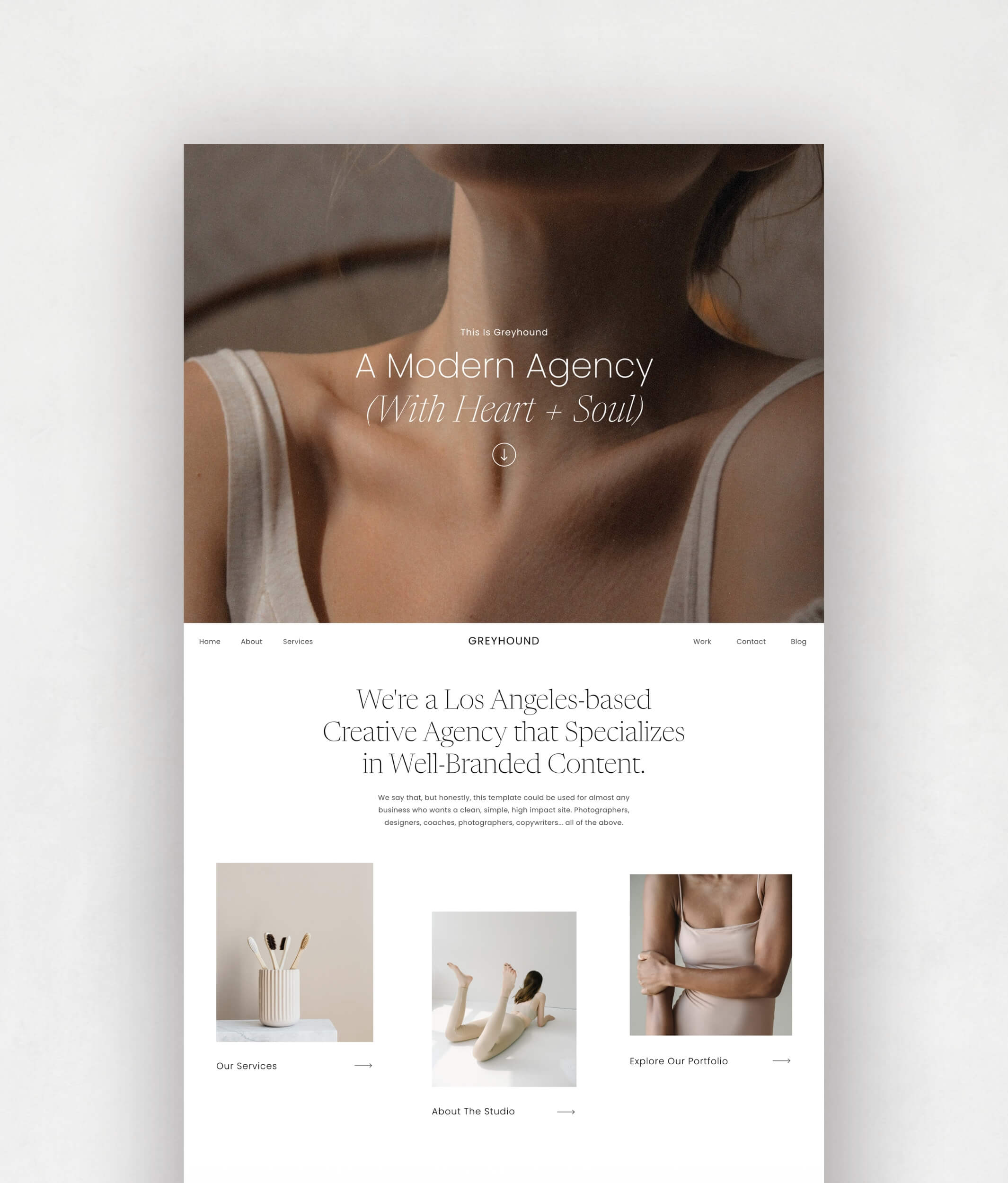 Sleek, effective, and oh-so-chic…we want to be like her. Soothing to browse and designed to sell, our Greyhound Showit website template was made for literally anyone who likes their online space uncluttered and wants to launch their beautiful site — quickly.